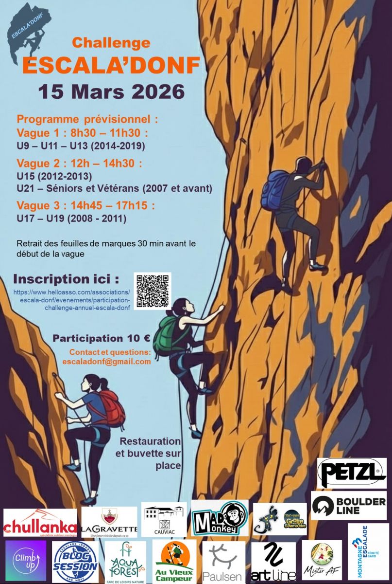 Les inscriptions pour le challenge ESCALA’DONF, qui aura lieu le dimanche 15 mars 2026 à la Halle des Sports de Quissac, sont ouvertes !